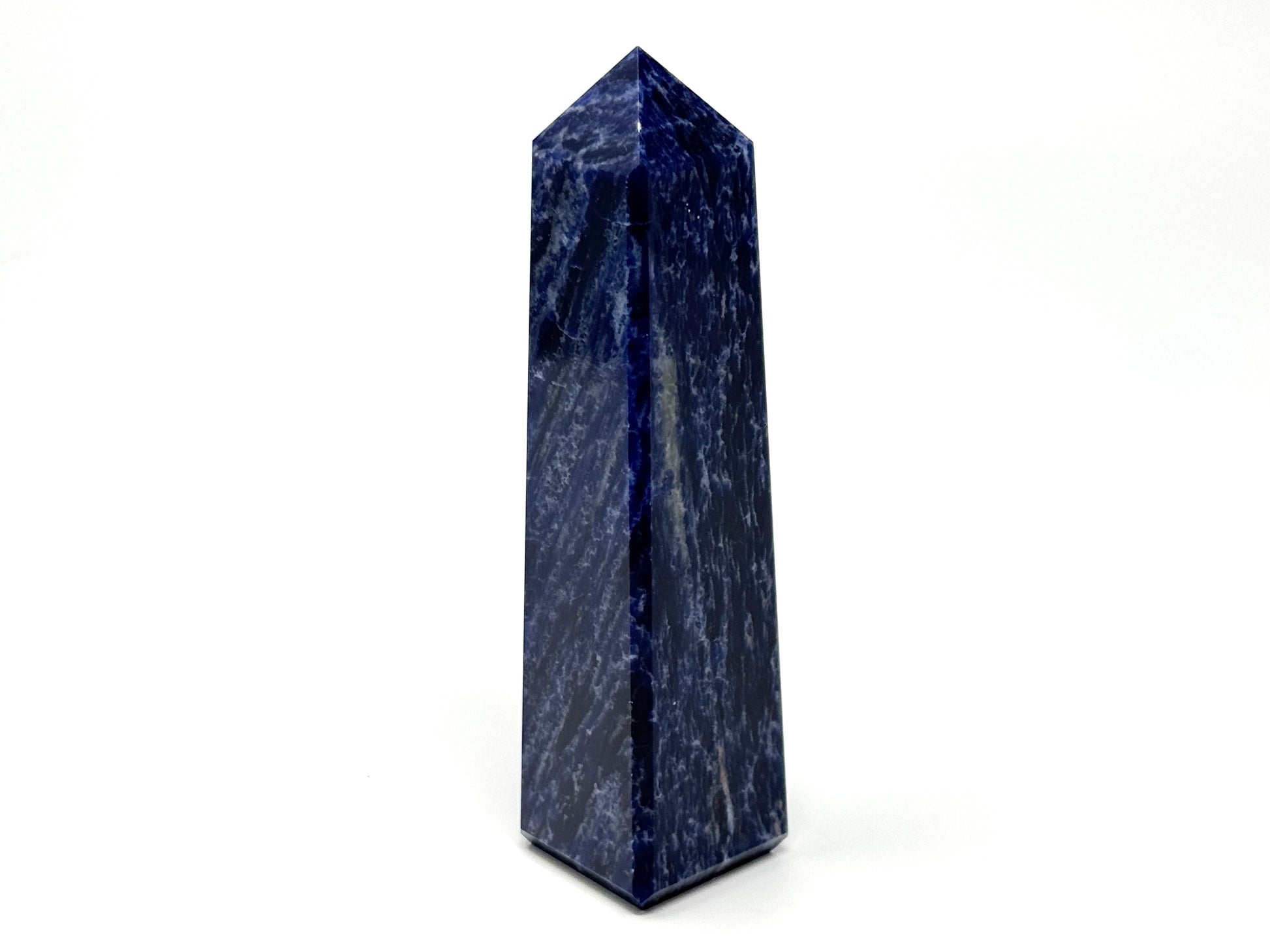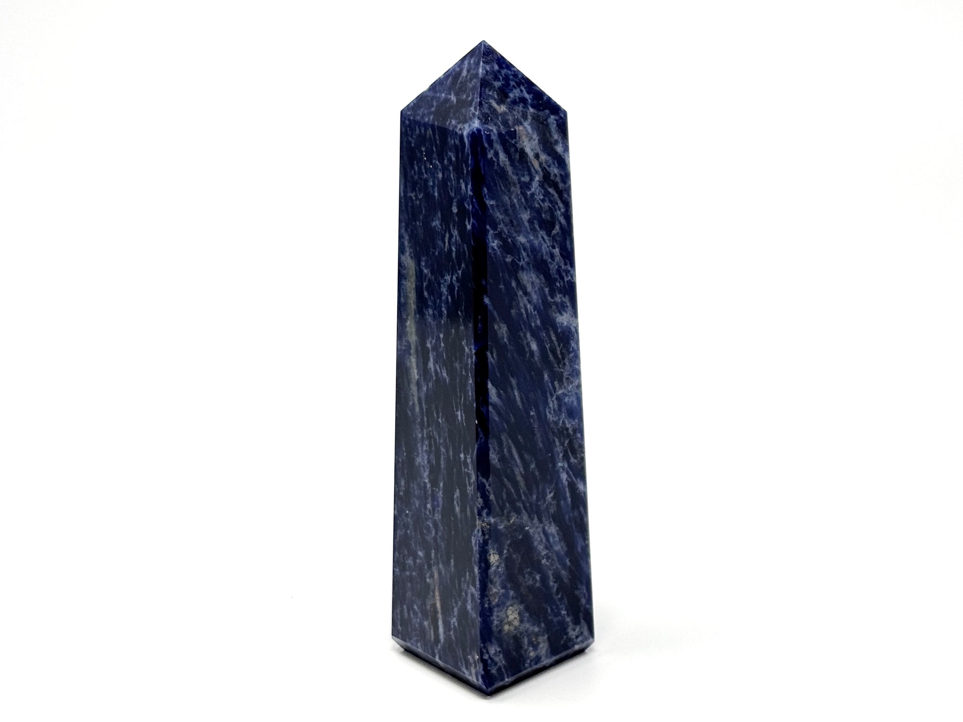 This blue Sodalite Tower Crystal (also known as a Sodalite Obelisk Crystal) has a smooth, sleek polish and showcases a tower/obelisk shape with a square base and a sharp pointed tip.