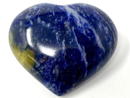 This gorgeous Sodalite Crystal Heart measuring 6.7cm wide displays a deep royal-blue hue contrasted against stunning Yellow Calcite and streaks of White Calcite, with striking orange-brown Hematite inclusions.