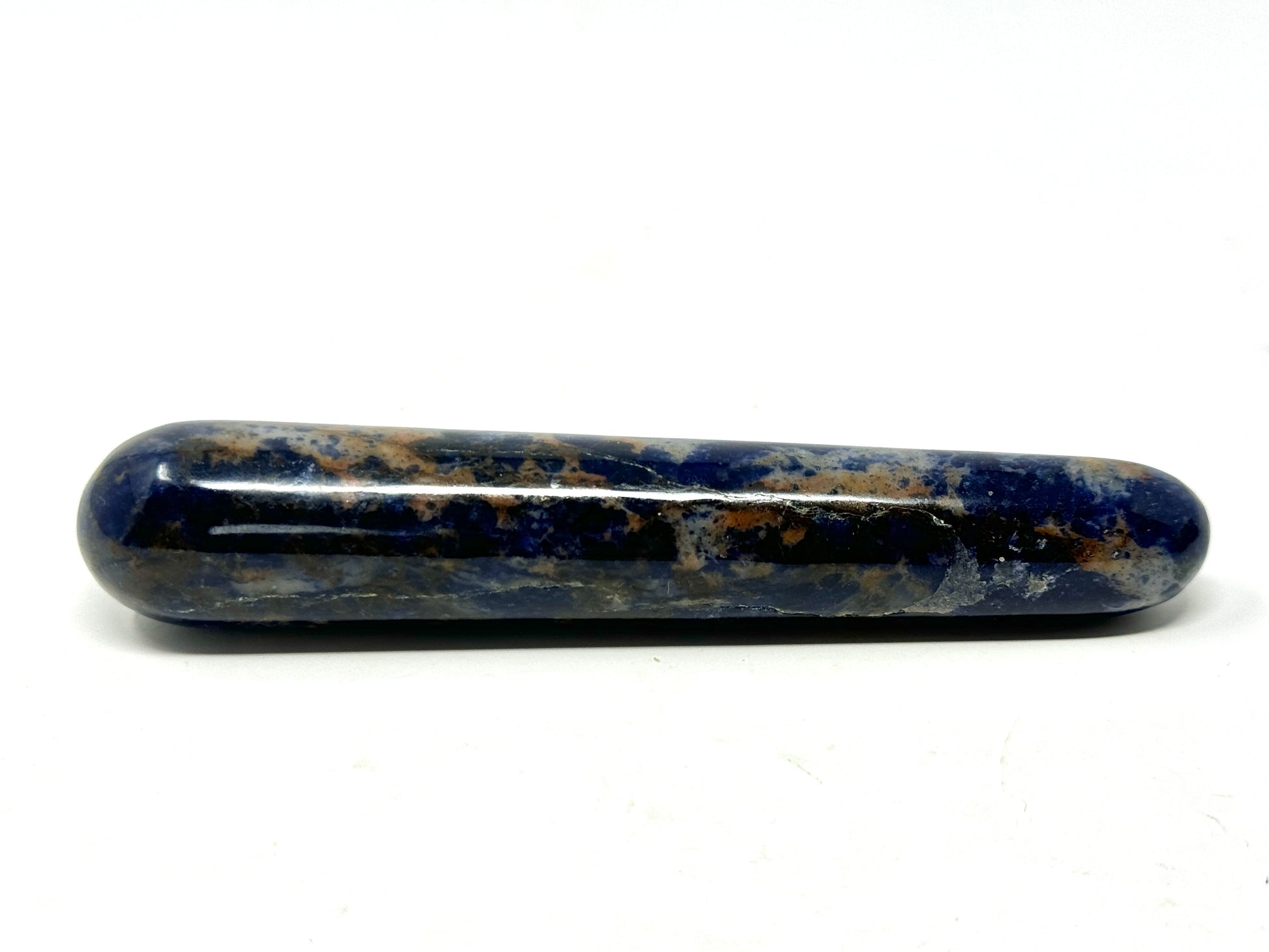 This gorgeous Sodalite Crystal Massage Wand measuring 12.6cm long displays a deep royal-blue hue, with some shimmering metallic Hematite inclusions as well as striking orange-brown Hematite inclusions.