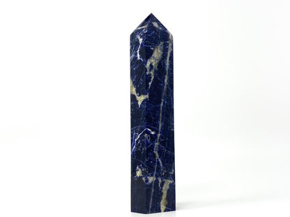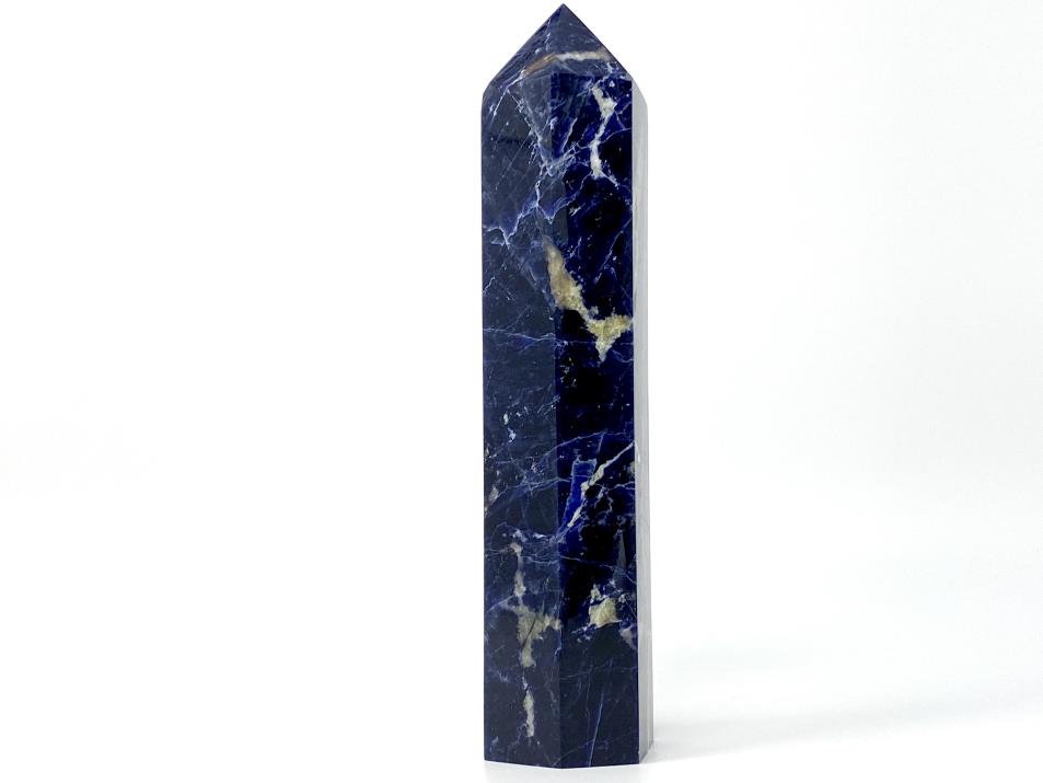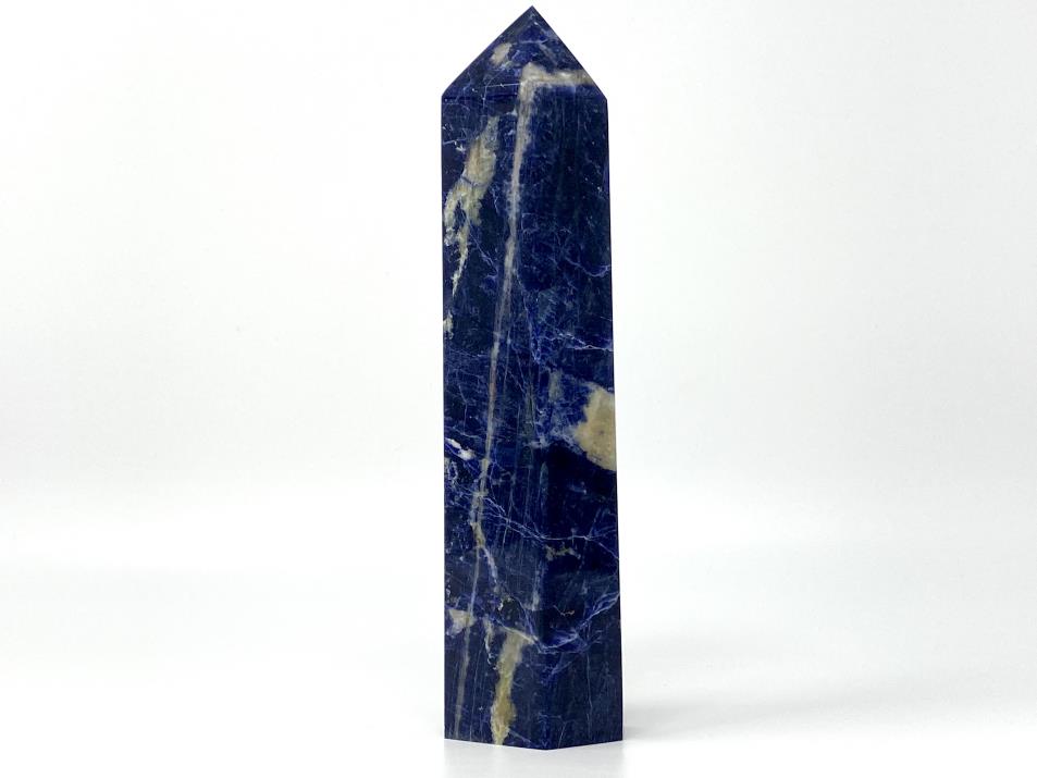This gorgeous Large Sodalite Crystal Point measuring a magnificent 23cm tall displays a free-standing base and a deep royal-blue hue contrasted against streaks and clouds of white and yellow Calcite.