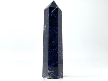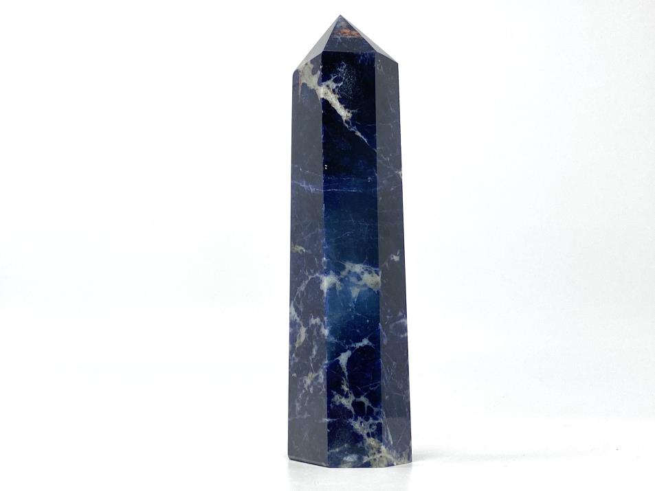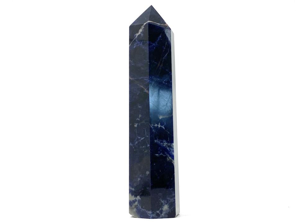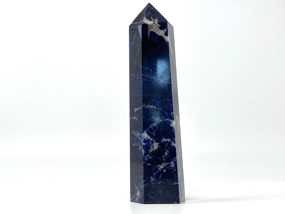 This blue Large Sodalite Point has a smooth, sleek polish and showcases many polished faces and a sharp pointed tip.