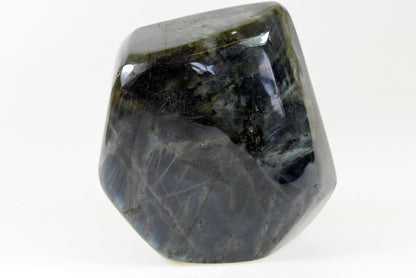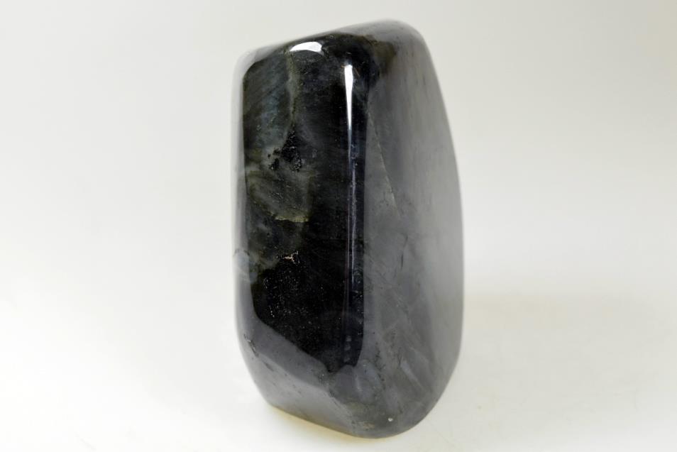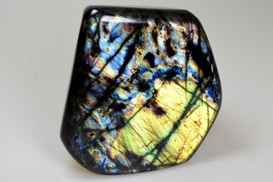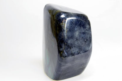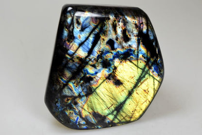 Spectrolite Freeform, crystal for sale from Madagascar. This stunning 10.2cm tall Spectrolite freeform is a very new find and we are proud to be offering this beautiful material for sale. We discovered the spectrolite from our 2017 spring trip and we were in awe at the stunning colours which are displayed within it, which feature the full colour spectrum which labradorite generally does not. It also can be called rainbow labradorite and it is a rare find in Madagascar as the general labradorite will just display colours of blue, green and yellow. the pieces we have here to offer can also display the beautiful purple and mauve colour range and purple labradorite is very collectable but genearally just gets used for jewellery. Spectrolite was initially a brand name for the material that was mined in Finland. Spectrolite is usually cut as a cabochon but sometimes you see larger pieces cut into freeforms and pebbles like the ones we have to offer here. Our spectrolite is ideal for the crystal healer and an amazing addition to any collector who would like this colourful and truly unique stone.