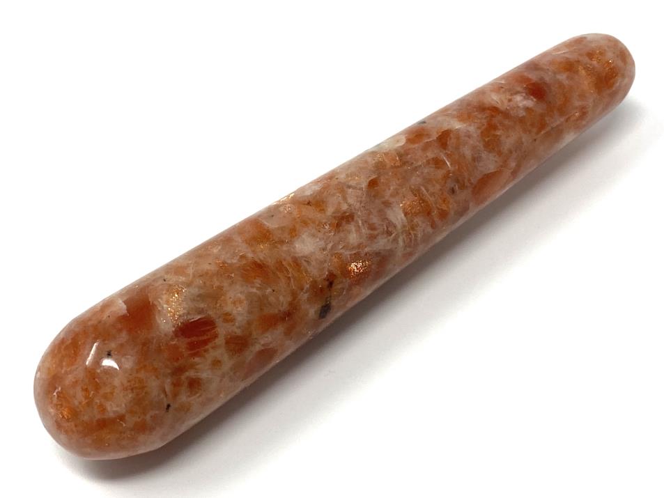 The Natural Sun Stone has been carefully cut into a smooth round crystal massage wand shape (a rounded crystal wand shape) and hand-polished to create a Polished Sunstone Crystal Massage Wand (or Sunstone Wand).