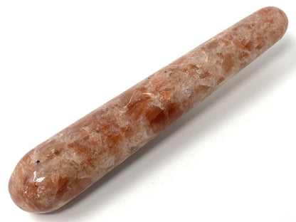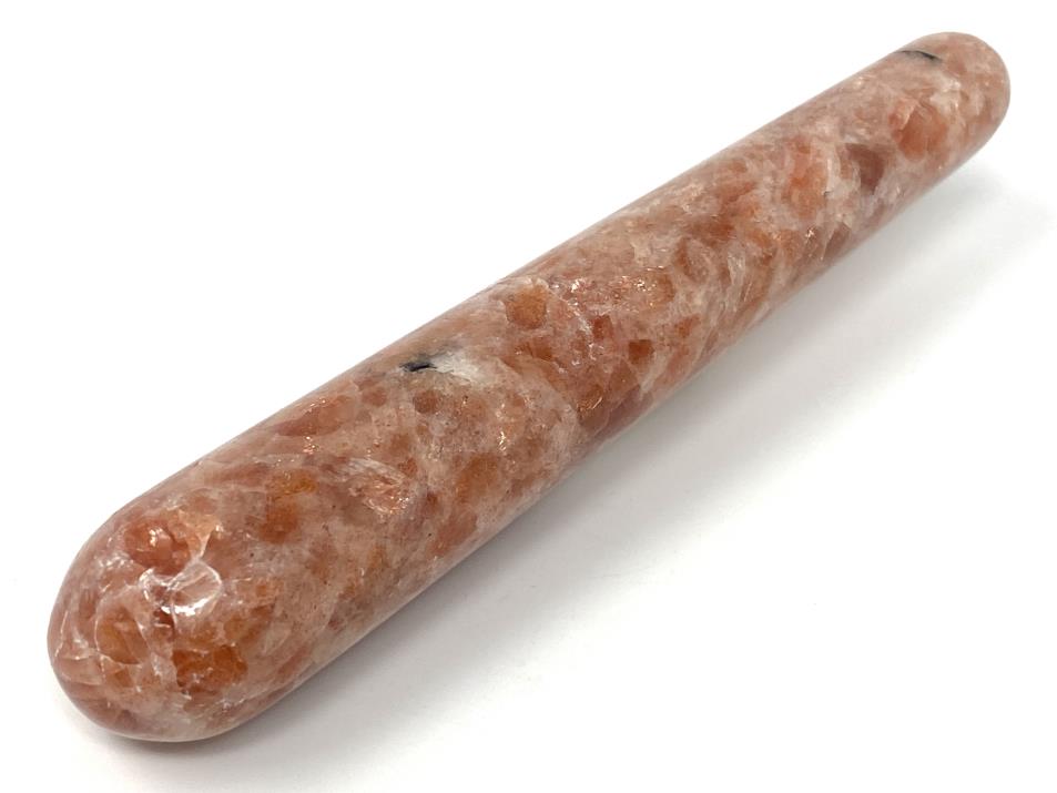 The Natural Sun Stone has been carefully cut into a smooth round crystal massage wand shape (otherwise known as a crystal wand shape) and hand-polished to create a Polished Sunstone Crystal Massage Wand (or Sunstone Wand).
