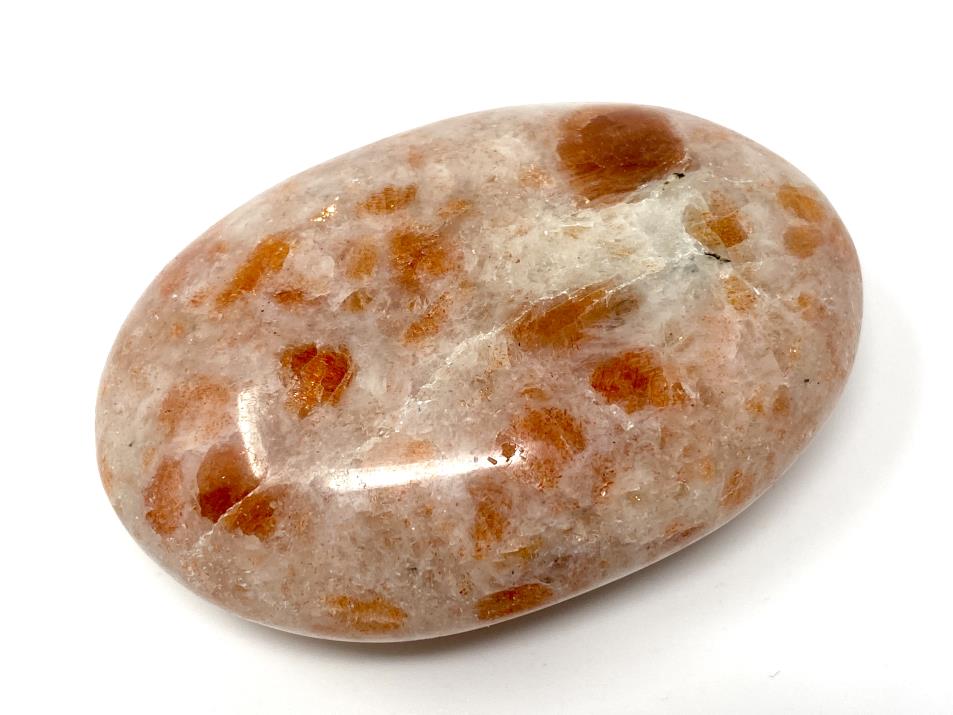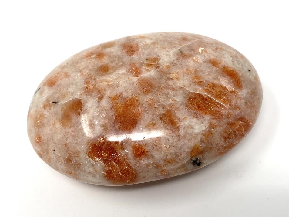 This stunning Sunstone Pebble (or Sunstone Palm Stone) measures 6.5cm long and displays gorgeous, glittering flecks of golden-orange contrasted against a creamy-white backdrop.
