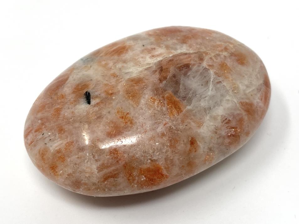 This stunning Sunstone Pebble (or Sunstone Palm Stone) measures 5.6cm long and displays gorgeous, glittering flecks of golden-orange contrasted against a creamy-white backdrop.