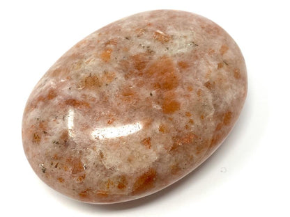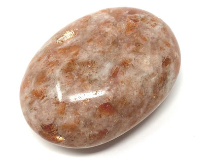 This stunning Sunstone Pebble (or Sunstone Palm Stone) measures 6.2cm long and displays gorgeous, glittering flecks of golden-orange contrasted against a creamy-white backdrop.