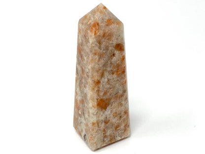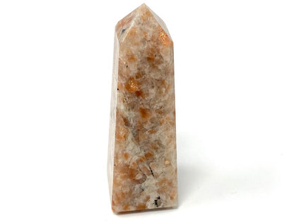 This stunning free-standing Sunstone Tower measures 8.5cm tall and displays gorgeous, glittering flecks of golden-orange contrasted against a creamy-white backdrop.