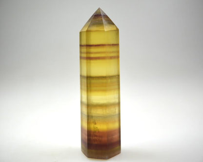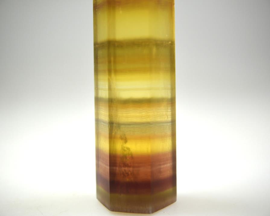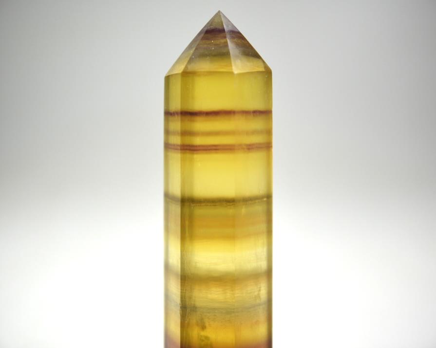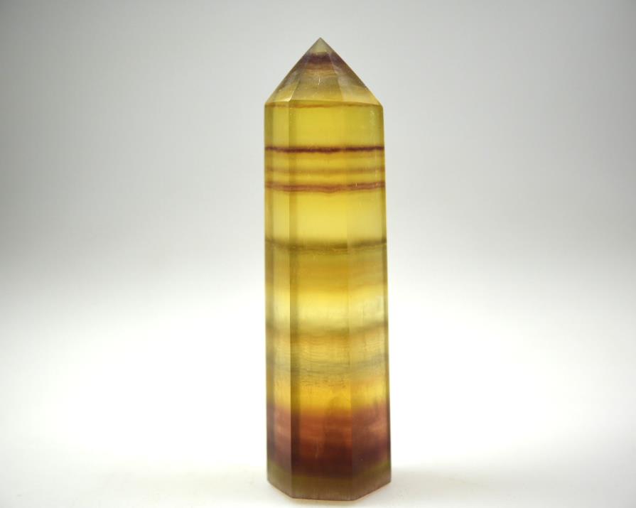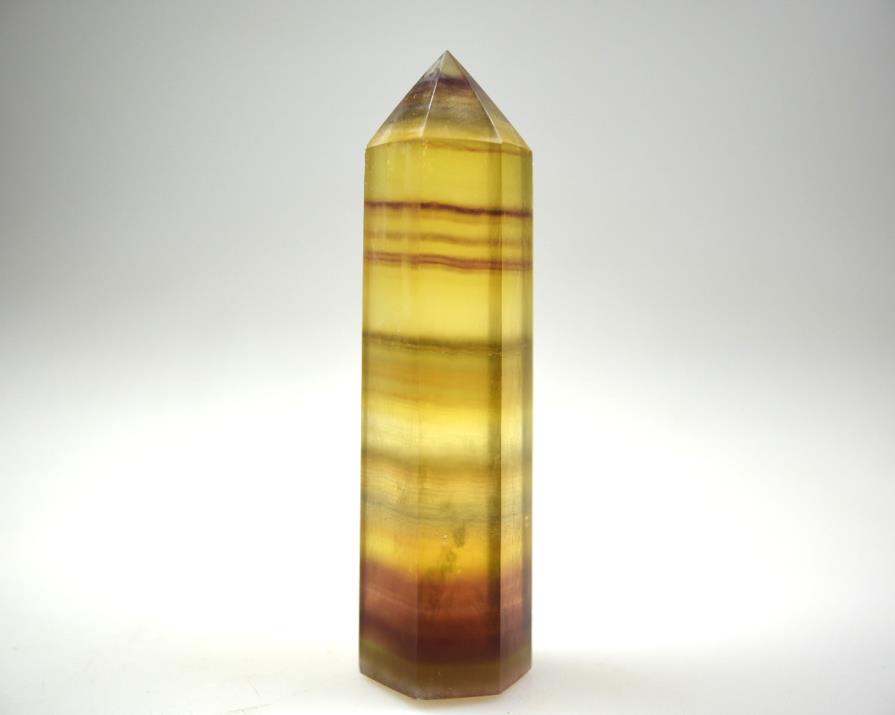 Yellow Fluorite Point, Crystal for sale. This amazing 9.4cm tall Yellow Fluorite cut point comes from China and is of a very high grade, displaying a beautiful golden tone with subtle purple stripes. Once illuminated it comes to life and is really different from all the other fluorites. Fluorite can occur in a crystalline or massive form and it is the mineral form of calcium fluoride, it has a cubic crystal habit. This amazing piece would make an unique addition to your fluorite collection. this would be ideal for the healer or for someone who simply likes beautiful tactile objects. China has an unbelievable range of fluorites and this golden yellow fluorite is one of the best.