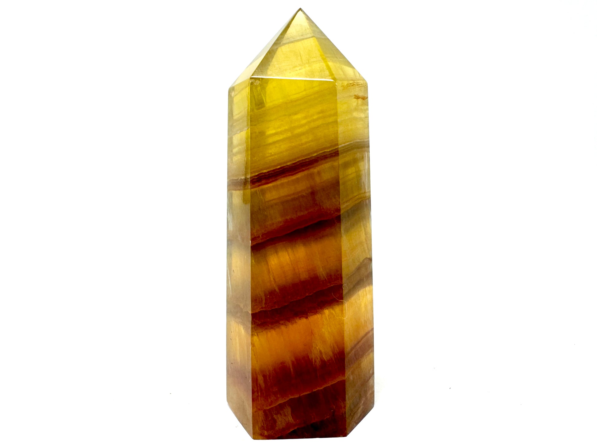 This beautiful 9.3cm tall free-standing Yellow Fluorite Crystal Point showcases a spectacular golden yellow shade.